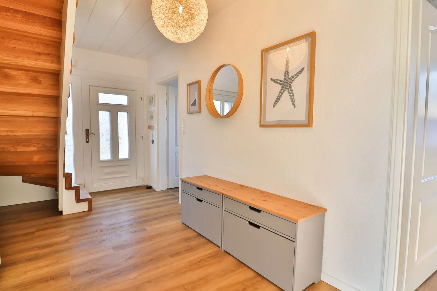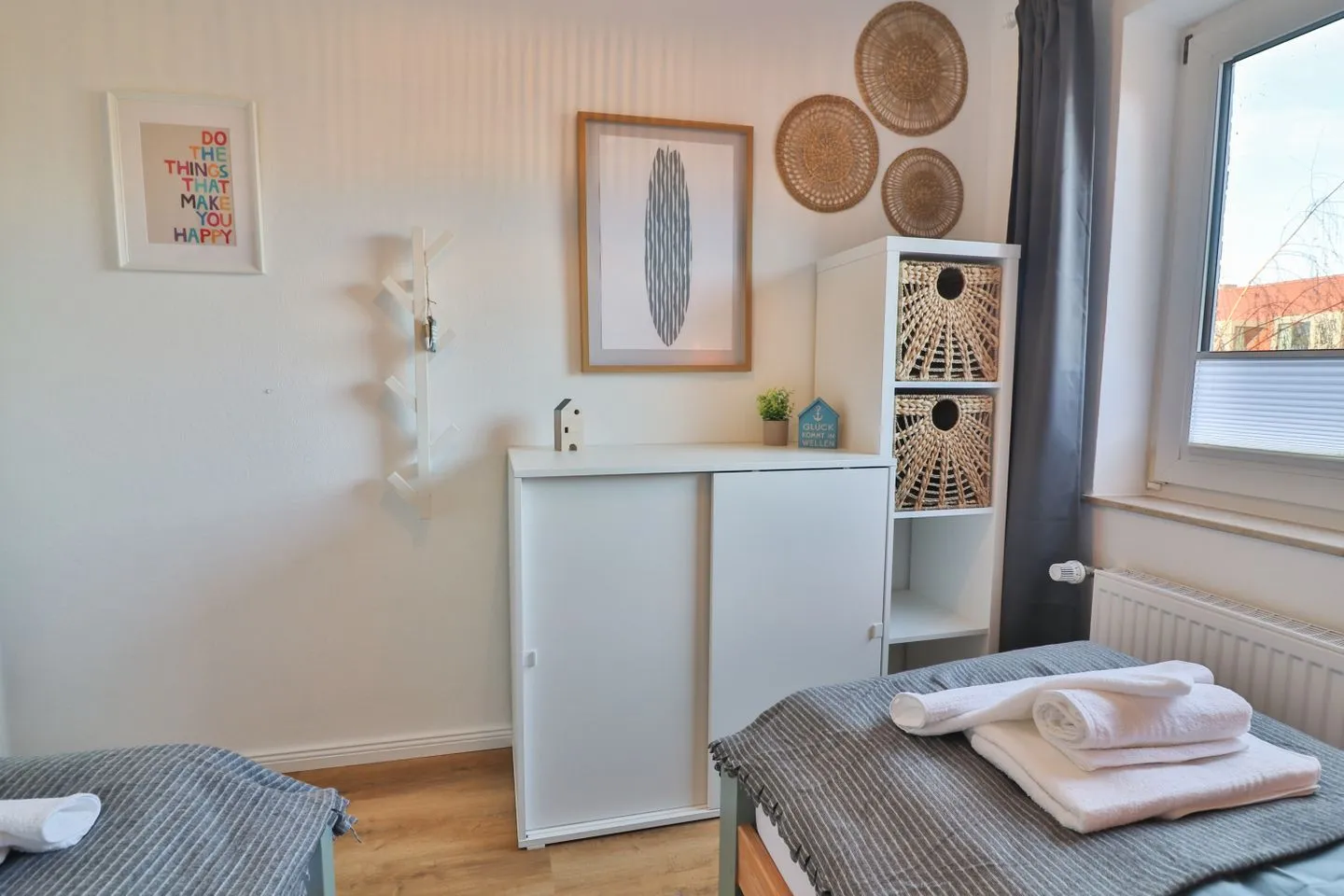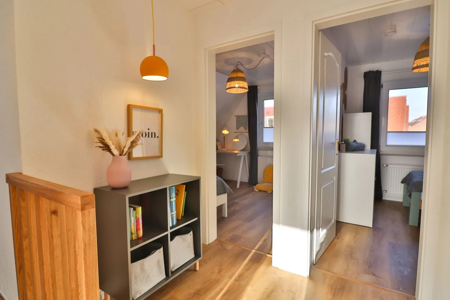 Mit insgesamt fünf Zimmern, darunter vier separate Schlafzimmer - je zwei Zimmer mit Doppelbetten (180 x 200 cm) und zwei mit Einzelbetten (je 90 x 200 cm), von denen sich eines der Schlafzimmer im Erdgeschoss befindet - bietet das Haus Meer reichlich Platz sowohl für erholsame Nächte als auch für ausreichend Privatsphäre und Gemütlichkeit für die einzelnen Gäste. Von einem der Doppelzimmer aus gelangen Sie auf den großen überdachten Balkon mit Blick in die Nachbarschaft.