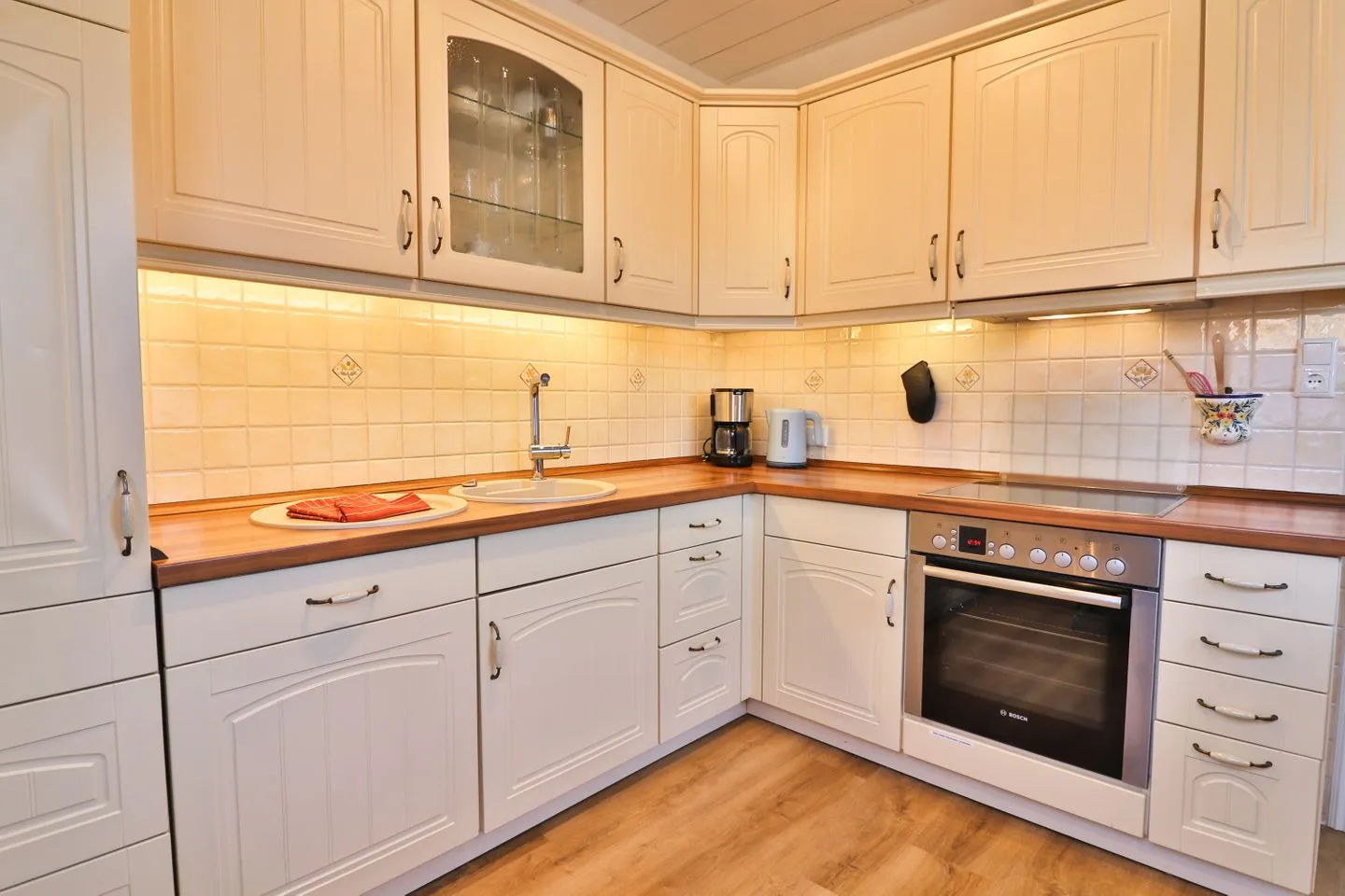 Die geschlossene Küche ist voll ausgestattet und bietet eine alternative Essmöglichkeit für vier Personen am runden Esstisch. Moderne Geräte wie Ceranherd, Backofen, Mikrowelle, Spülmaschine, Kaffeemaschine, Toaster, Wasserkocher, Kühlschrank und Gefrierschrank sowie eine umfassende Auswahl an Küchenutensilien lassen keine Wünsche offen.