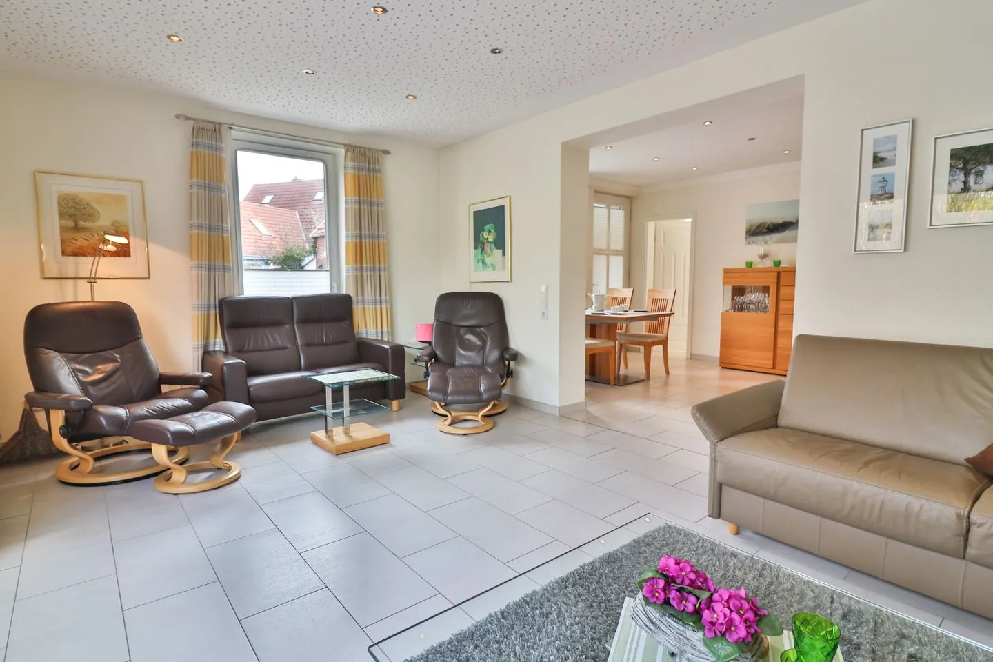 Der Wohnbereich ist komfortabel und großzügig gestaltet und lädt mit zwei Sofas - davon ein Schlafsofa (140 x 195 cm) - und einem Sessel zum Verweilen ein. Für Ihre Unterhaltung sind zwei Fernseher, eine HiFi-Anlage und zahlreiche Bücher vorhanden. Dank des kostenfrei verfügbaren WLANs bleiben Sie auch während Ihres Aufenthalts immer gut vernetzt.