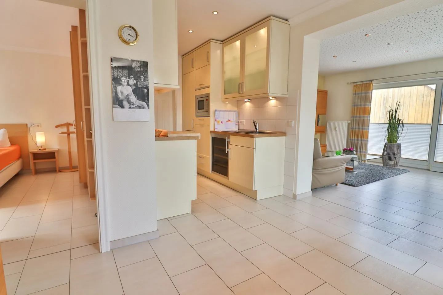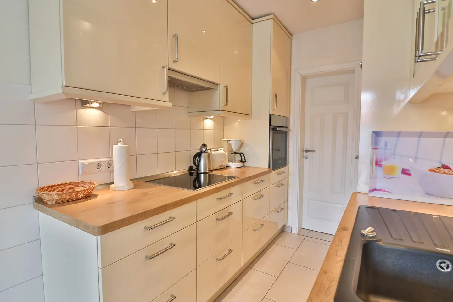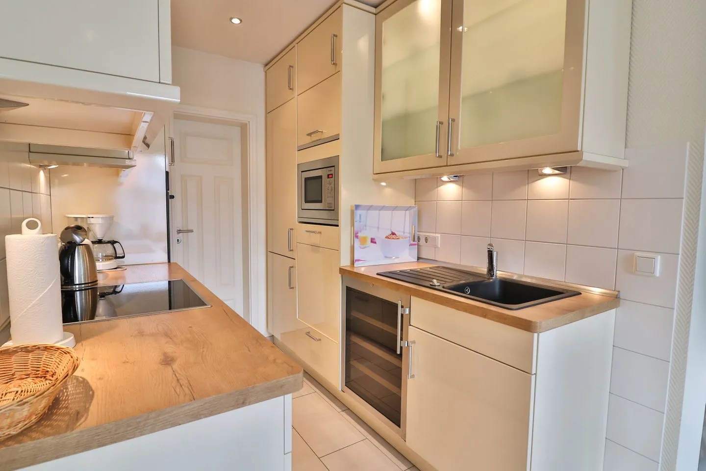 Die Küche ist als Kochnische umfassend ausgestattet und funktional eingerichtet. Das Highlight ist hier der separate Getränkekühlschrank. Ihnen stehen ein 4-Platten-Herd, Backofen, Mikrowelle, Spülmaschine, Kühlschrank, ein zusätzlicher Gefrierschrank, Kaffeemaschine, Tassimo-Espressomaschine, Wasserkocher, Toaster, Eierkocher und Mixer zur Verfügung. Damit sind sowohl die schnelle Mahlzeit als auch ausgedehnte Kochabende problemlos möglich -Ihre Lieblingsmahlzeiten können Sie im Essbereich gemeinsam genießen.
