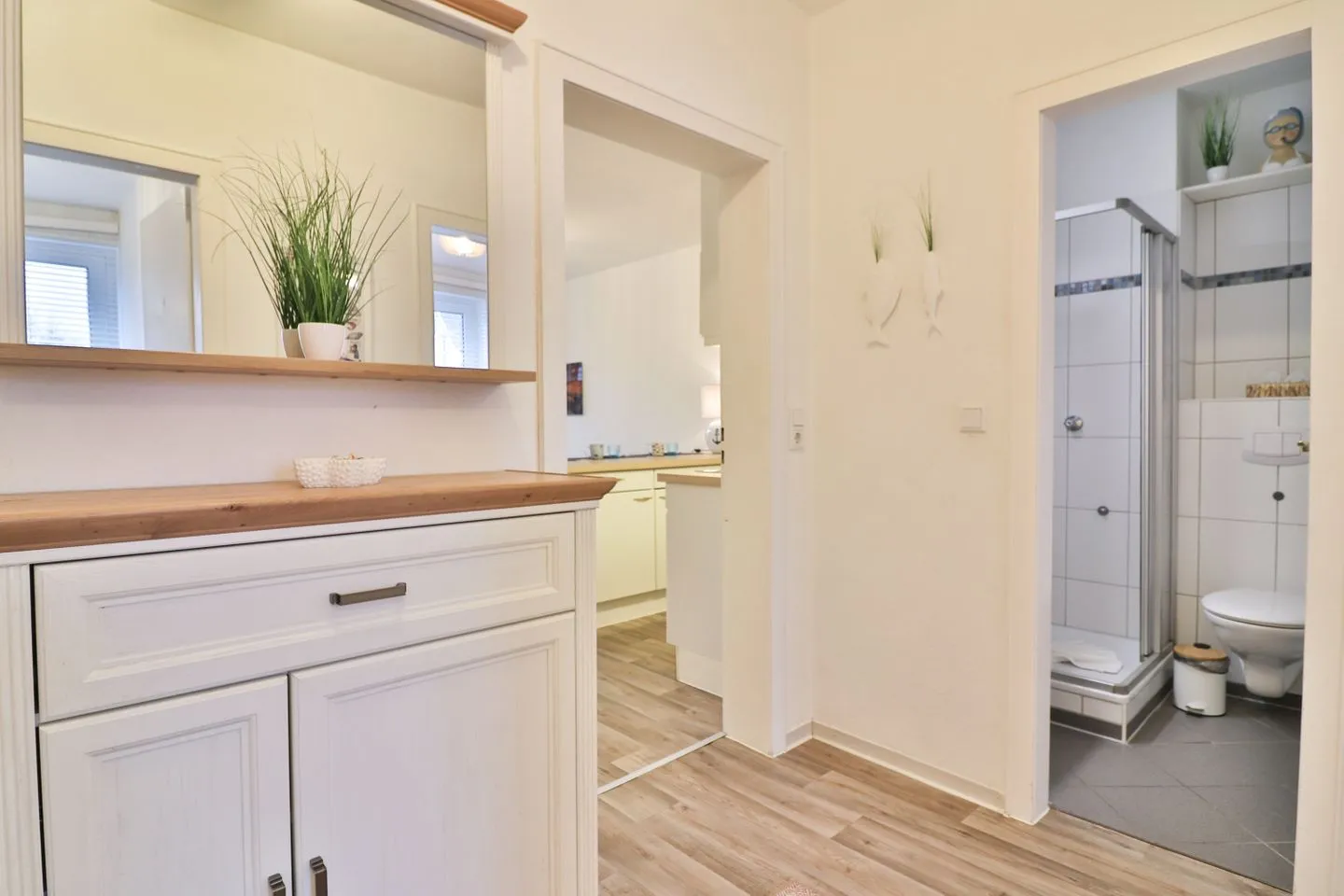 Das Badezimmer rundet den hohen Wohnkomfort der Ferienwohnung ab. Es ist ausgestattet mit einer Dusche, WC, Waschbecken und einer Handtuchheizung und bietet alles, was Sie für einen entspannten Start in den Tag oder eine erfrischende Dusche nach einem Urlaubstag benötigen.