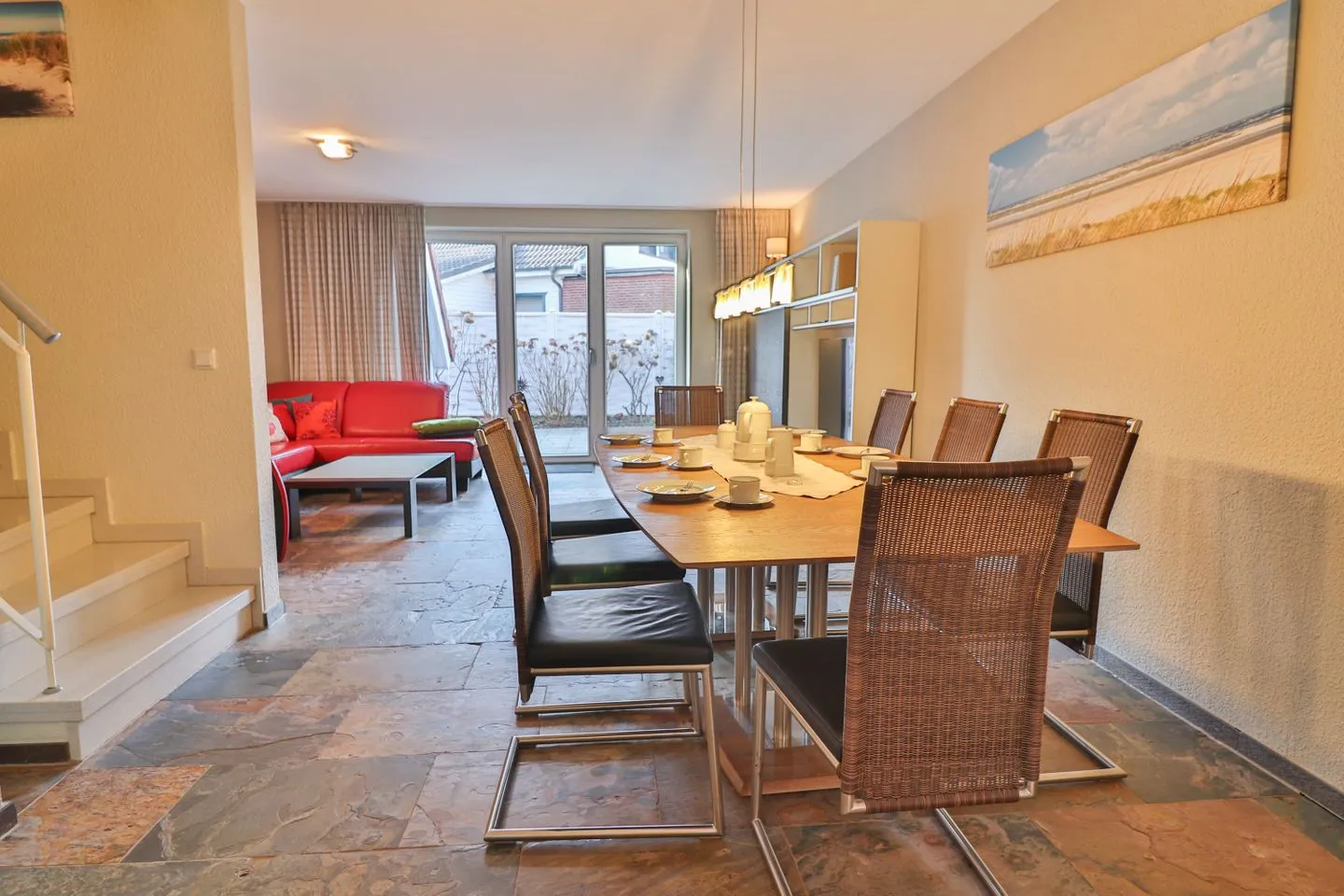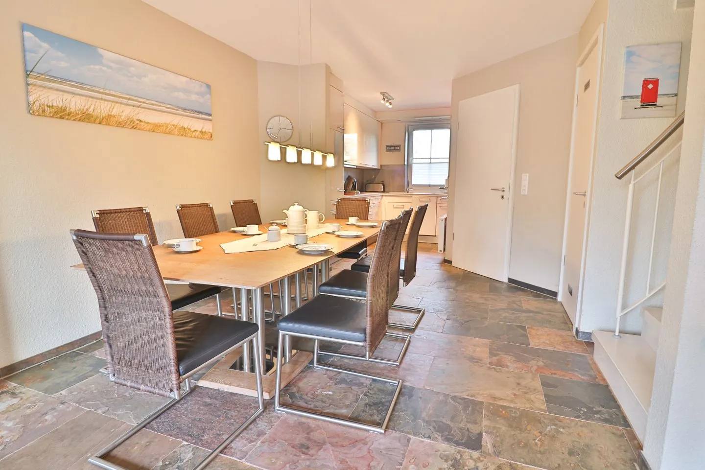 Die Küche ist offen zum Wohnzimmer gestaltet und bietet alles, was Sie für die Zubereitung leckerer Gerichte benötigen: Herd und Backofen, Mikrowelle, Kühlschrank mit Gefrierfach sowie eine Spülmaschine. Für den Start in den Tag stehen eine Filterkaffeemaschine, eine Espressomaschine (Senseo), ein Wasserkocher und ein Toaster bereit; auch ein Mixer ist vorhanden. Der große Esstisch rundet das gemeinsame Kochen und Genießen ab. Hier ist viel Platz für leckere Mahlzeiten, abendliche Brettspielrunden oder die Planung der kommenden Urlaubstage auf Langeoog.
