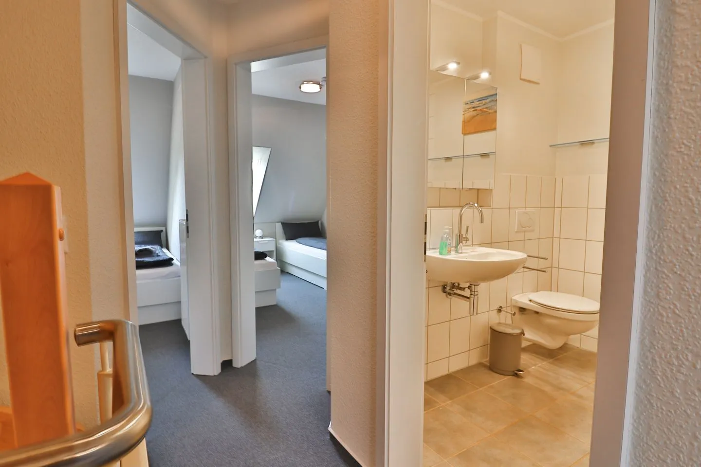 Im Obergeschoss befinden sich drei Schlafzimmer mit gemütlichen Betten - eines mit Doppelbett (180 x 200 cm) und zwei mit je zwei Einzelbetten (80 x 200 cm) - sowie großen Kleiderschränken mit reichlich Stauraum für Ihre persönlichen Gegenstände.