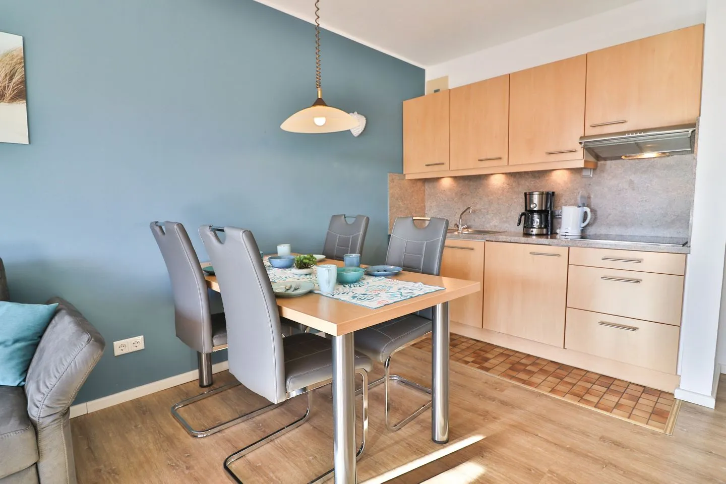 Die offene Küche ist funktional in den Wohnraum integriert und bietet mit 4-Platten-Ceran-Herd, Mikrowelle, Kühlschrank mit Gefrierfach, Spülmaschine, Kaffeemaschine, Toaster und Wasserkocher eine komfortable Grundlage für Ihre Selbstversorgung. Ein kleiner Backofen im Abstellraum ermöglicht Ihnen die Zubereitung zusätzlicher Speisen, die Sie am Esstisch genießen können.