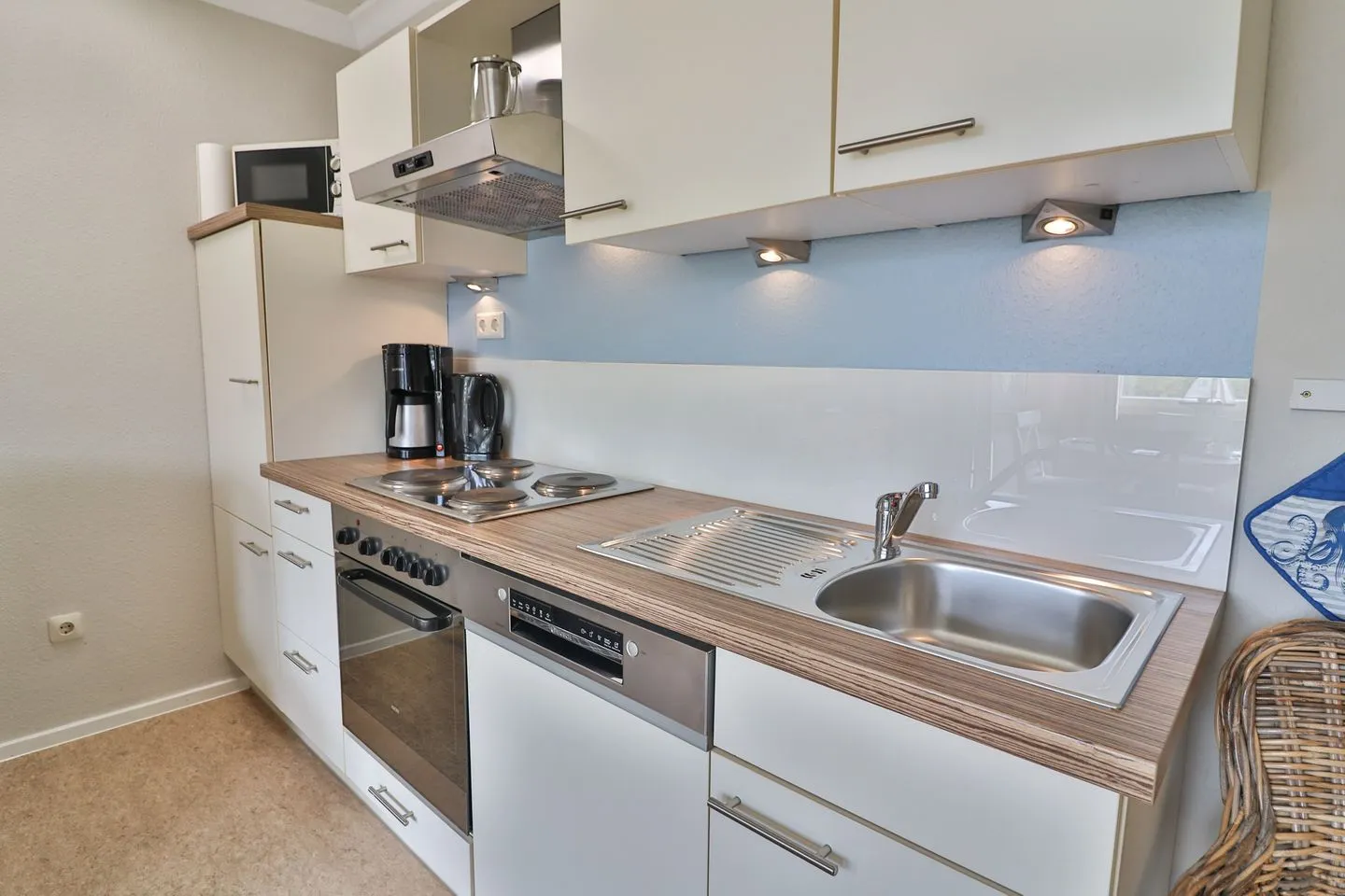 Die Küchenzeile ist mit modernen Geräten und umfassendem Zubehör ausgestattet: Ihnen stehen ein 4-Platten-Herd, Backofen, Mikrowelle, Kaffeemaschine, Wasserkocher, Toaster und ein Kühlschrank mit Gefrierfach zur Verfügung. Auch Spülmaschine, Geschirr, Besteck, Küchenutensilien und ein Mixer sind vorhanden, sodass Sie alle Mahlzeiten problemlos selbst zubereiten können.