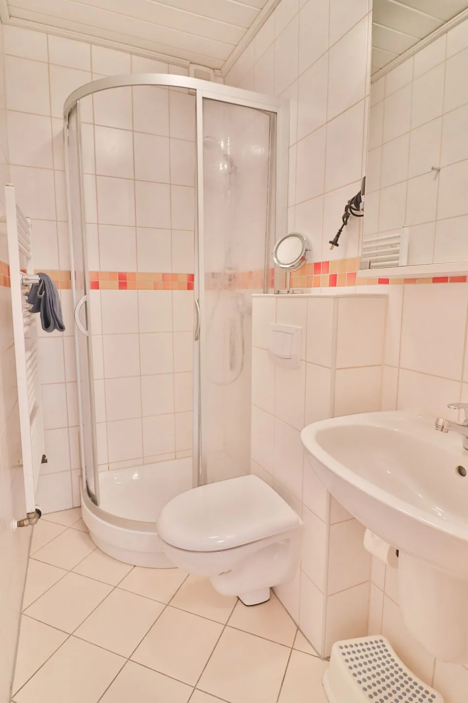 Das separate Schlafzimmer sorgt für Privatsphäre und ist mit einem komfortablen Doppelbett für zwei Personen ausgestattet. Sichtschutz an allen Fenstern sowie Kleiderschrank, Garderobe und Kommode ergänzen die Ausstattung. Im modern gestalteten Badezimmer erwartet Sie eine Dusche, Waschbecken, Haartrockner und WC.