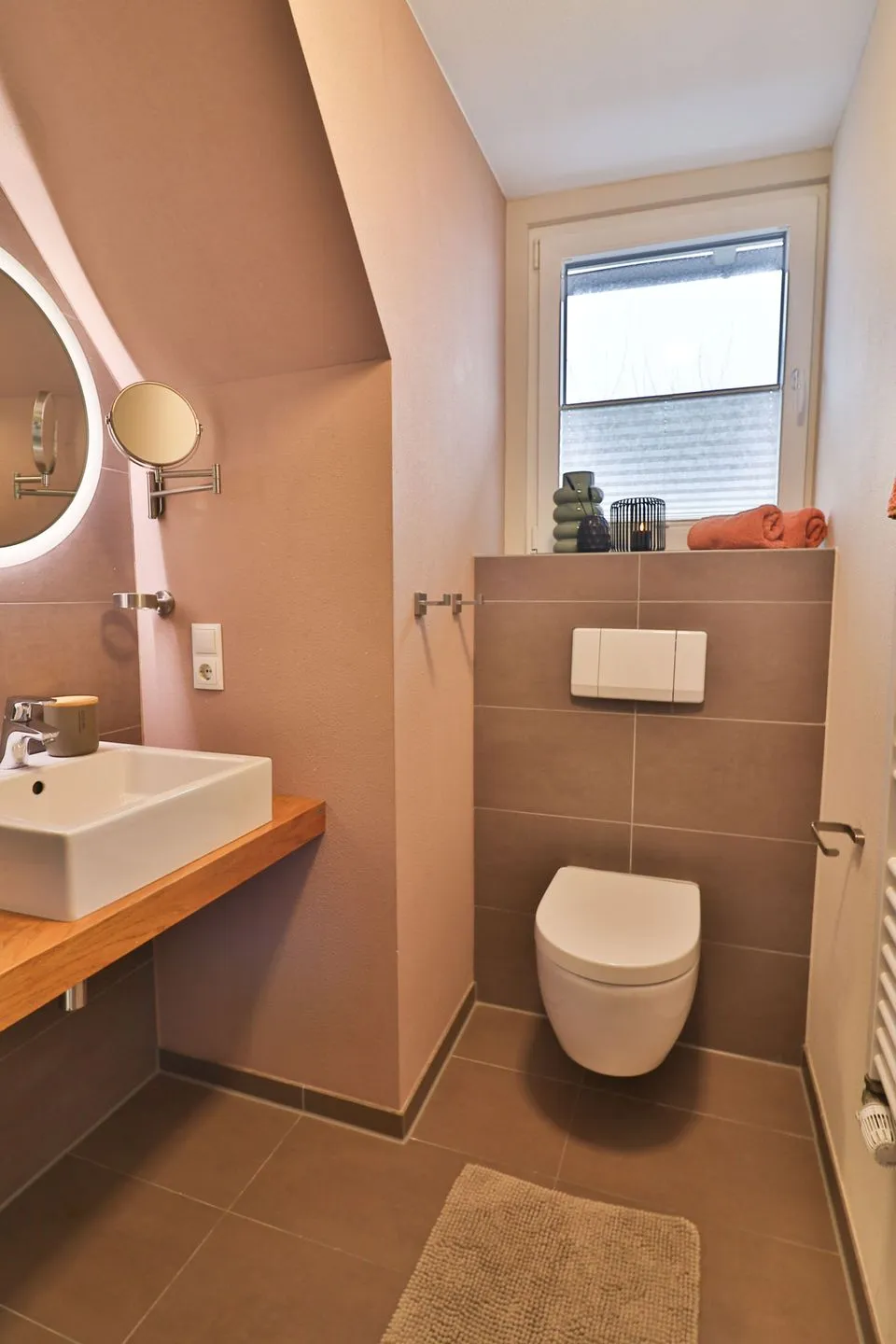Das helle Tageslichtbad mit Dusche, WC und Waschbecken sorgt für einen frischen Start in den Tag. Haartrockner, Spiegel und Kosmetikspiegel stehen ebenfalls für Sie bereit.